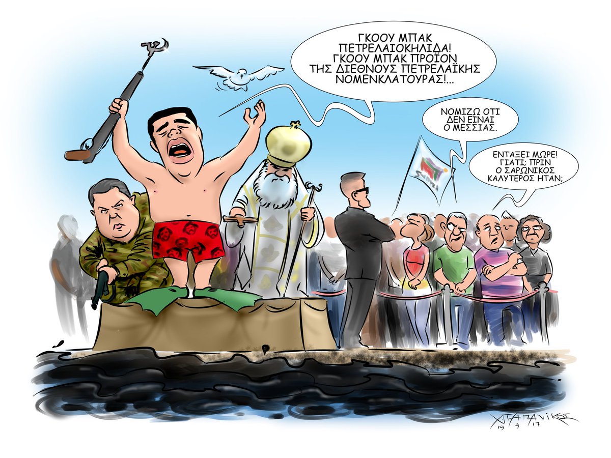 - Ορίστε, εγώ δεν βλέπω καμία #πετρελαιοκηλίδα. - Η θάλασσα βρίσκεται απ' την άλλη μεριά κύριε Πρόεδρε.