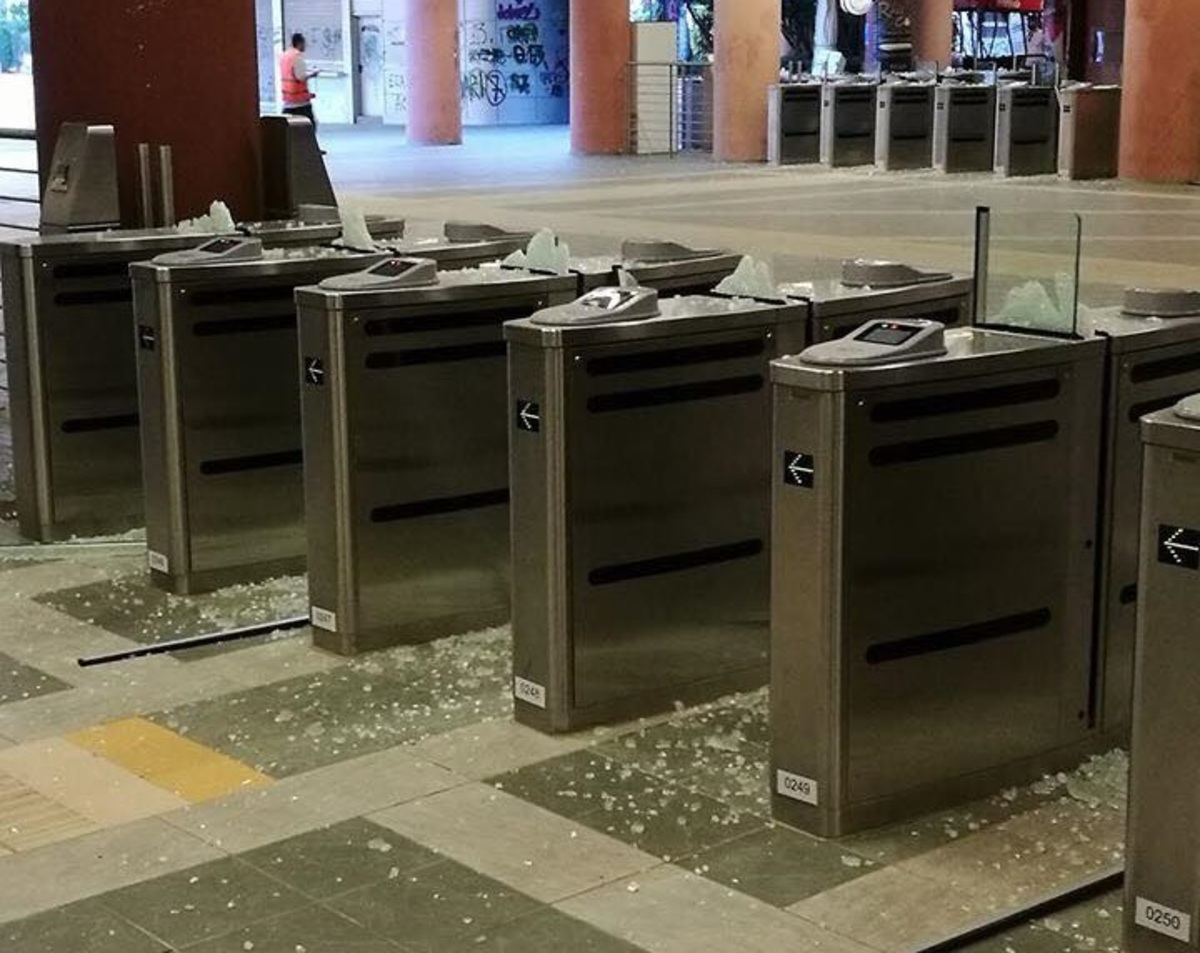 Περίπου 10-15 άτομα, φορώντας κράνη και κουκούλες, και κρατώντας λοστούς, έσπασαν τα ακυρωτικά μηχανήματα του σταθμού.