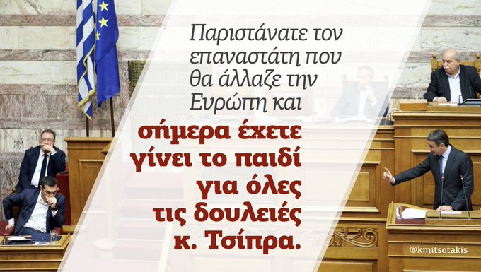 - Κύριε Τσίπρα εκτός απο αναξιόπιστος είστε και ένας πρωθυπουργός αδύναμος και υπο προθεσμία. Κυβερνάτε έως ότου αποφασίσετε με τον κ. Καμμένο να βάλετε ένα τέλος στην παθιασμένη σας σχέση