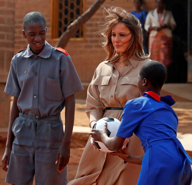 Η Πρώτη Κυρία των ΗΠΑ Μελάνια Τραμπ προσέφερε μπάλες ποδοσφαίρου και βιβλία στους μικρούς μαθητές κατά την επίσκεψή της σε ένα σχολείο στο Μαλάουι της Αφρικής...