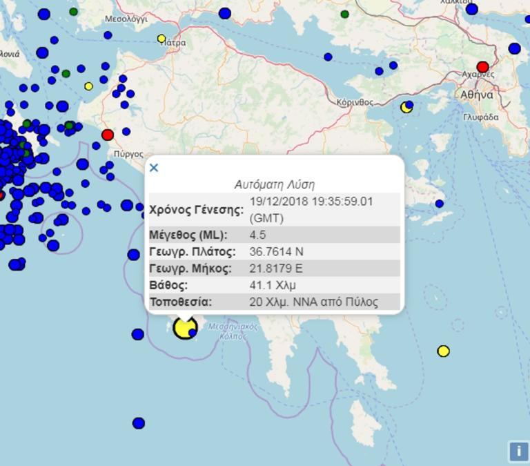 Σεισμός σημειώθηκε στις 21.35 το βράδυ της Τετάρτης, 19.12.2018, με το επίκεντρο να είναι κοντά στην Καλαμάτα, συγκεκριμένα μεταξύ Κορώνης και Μεθώνης.