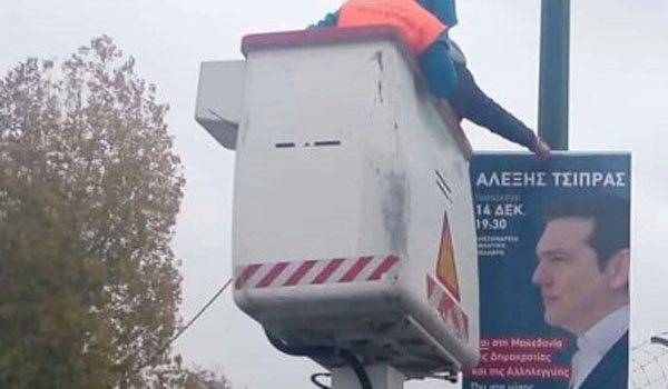 Συνεργεία του δήμου Θεσσαλονίκης κατεβάζουν από το πρωί της Πέμπτης τις αφίσες και τα μπάνερ που μπήκαν σε κολώνες για την ομιλία του Αλέξη Τσίπρα στη Θεσσαλονίκη την Παρασκευή.