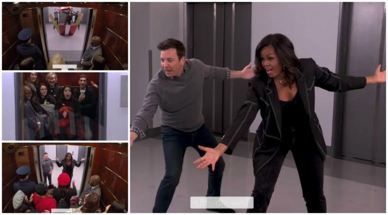 Οι πολίτες είναι στο ασανσέρ και σταματούν στον… λάθος όροφο: Δηλαδή σε αυτόν που βρίσκονται η Μισέλ Ομπάμα και ο Τζίμι Φάλον!