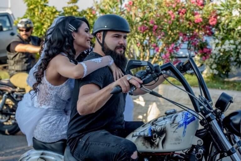 Η πανέμορφη νύφη έκανε εντυπωσιακή είσοδο με μηχανές Harley Davidson και τον σύλλογο Bikers Club Κρήτης, ξεσηκώνοντας, όπως ήταν αναμενόμενο, συγγενείς και φίλους!