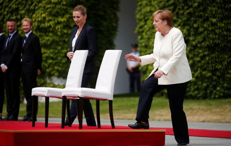 Η Γερμανίδα Καγκελάριος Άγκελα Μέρκελ παρακολούθησε την Πέμπτη (11.7.2019) καθιστή την τελετή υποδοχής της πρωθυπουργού της Δανίας, 24 ώρες αφότου εθεάθη να τρέμει ενώ στεκόταν στο πλευρό του πρωθυπουργού της Φινλανδίας - στο 3ο επεισόδιο τρόμου μέσα σε διάστημα τριών εβδομάδων.