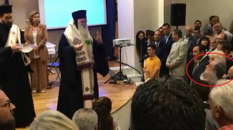 Εκείνη την στιγμή, παρενέβη ο βουλευτής Κώστας Μάρκου, τον διέκοψε και τον διόρθωσε λέγοντας προς τον Μητροπολίτη ότι το σωστό είναι το «νίκας τοις ευσεβέσι».