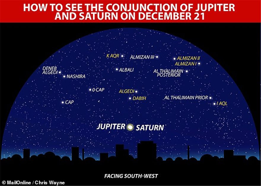 Στην κοντινότερη θέση τους μετά από πολλές εκατοντάδες χρόνια, οι δύο πλανήτες θα εμφανίζονται πως απέχουν λιγότερο από το πλάτος ενός «γεμάτου» φεγγαριού - από το χειμερινό ηλιοστάσιο και μέχρι την ημέρα των Χριστουγέννων.