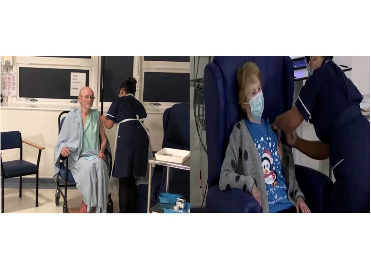 Οι δυο άνθρωποι που έκοψαν πρώτοι το νήμα στην μεγαλύτερη επιχείρηση μαζικού εμβολιασμού στην Βρετανία είναι και οι δυο ηλικιωμένοι καθώς ανήκουν στις ευπαθείς ομάδες που έχει οριστεί ότι θα κάνουν κατά προτεραιότητα το εμβόλιο κατά του κορονοϊού.