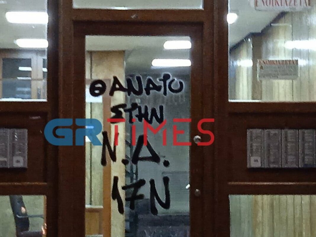 Πληροφορίες αναφέρουν ότι μέλη του αντιεξουσιαστικού χώρου που συμμετείχαν στην συγκέντρωση, βγήκαν από την πορεία και έγραψαν το σύνθημα στην πόρτα του κτιρίου.