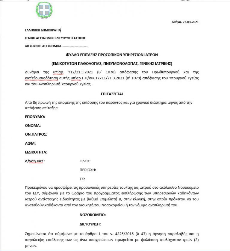 Το φύλλο επιστράτευσης των γιατρών της Αττικής, δόθηκε στη δημοσιότητα.