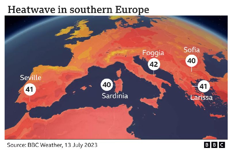 Την Πέμπτη, ο Ευρωπαϊκός Οργανισμός Διαστήματος δήλωσε ότι οι θερμοκρασίες θα μπορούσαν να φτάσουν τους 48 βαθμούς Κελσίου στα ιταλικά νησιά της Σικελίας και της Σαρδηνίας: «πιθανώς οι θερμότερες θερμοκρασίες που έχουν καταγραφεί ποτέ στην Ευρώπη», στο νέο κύμα καύσωνα που παίρνει το όνομα «Χάρος».