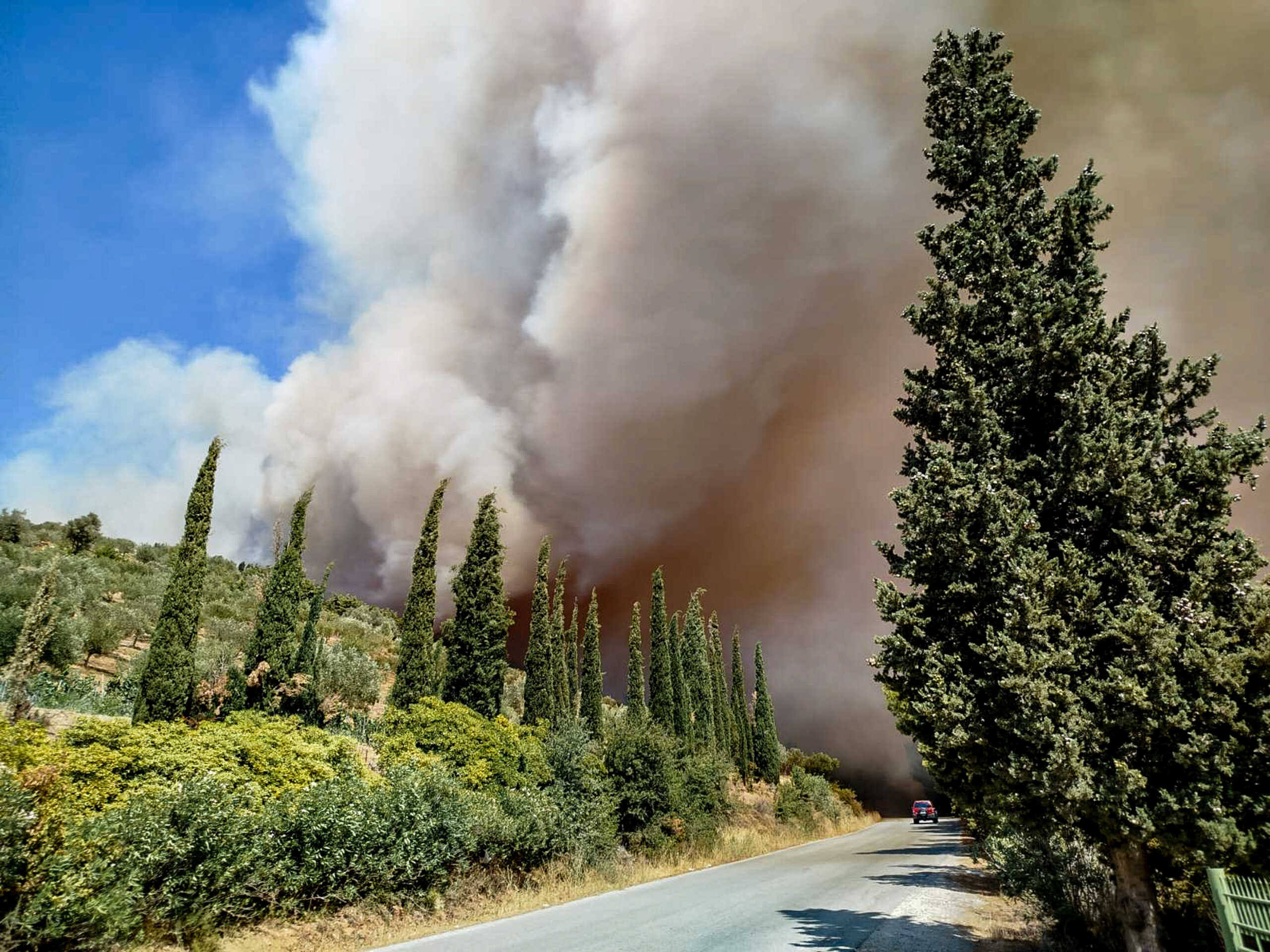 Πυροσβεστική και κάτοικοι δίνουν πραγματική μάχη η φωτιά να μην φτάσει στα σπίτια.