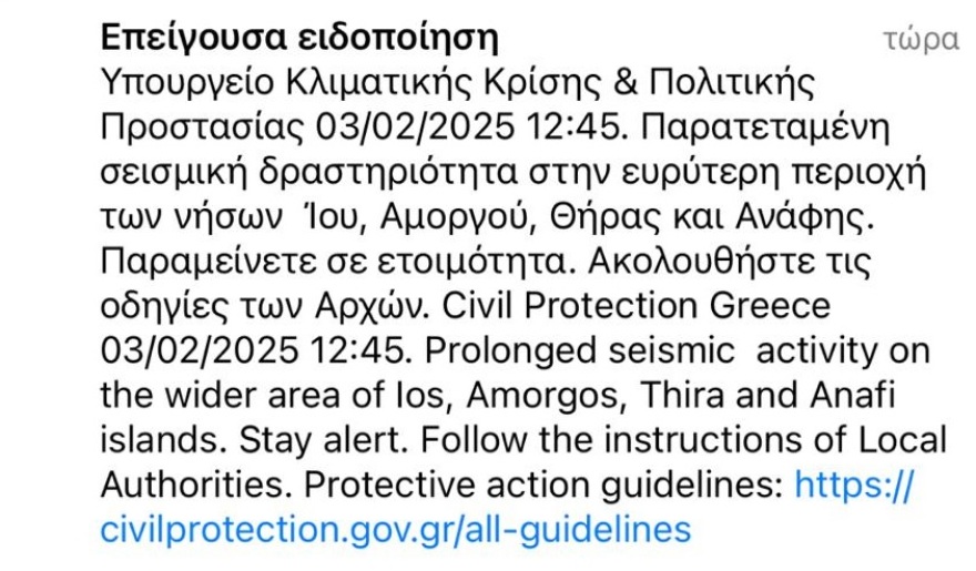 Σε συνέχεια προηγούμενης ενημέρωσής μας και σύμφωνα με την υπ. αριθμ. 1/2025 απόφαση του Συντονιστικού Τοπικού Οργάνου Πολιτικής Προστασίας του Δήμου Αμοργού και της σημερινής σύσκεψης που πραγματοποιήθηκε στο Υπουργείο Κλιματικής Κρίσης και Πολιτικής Προστασίας με αντικείμενο την αυξημένη σεισμική δραστηριότητα στην περιοχή μεταξύ Αμοργού – Σαντορίνης: