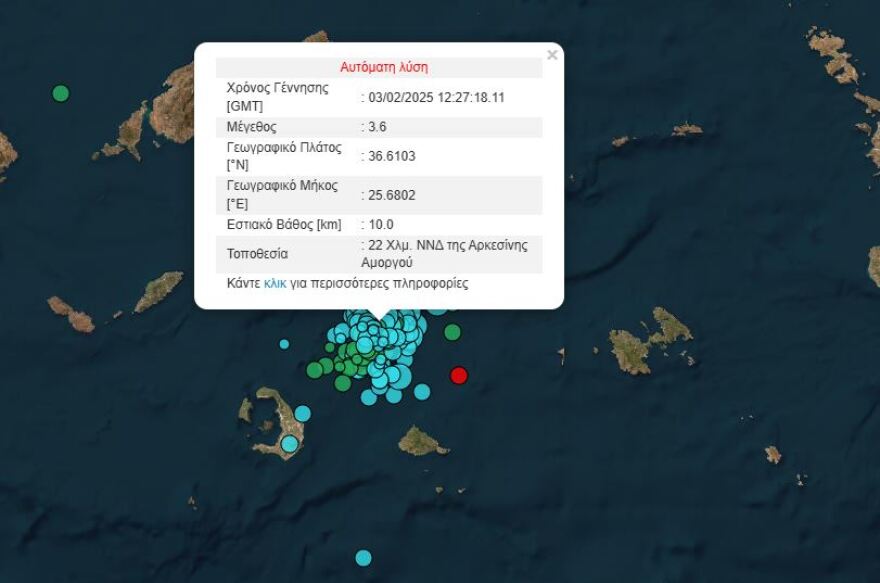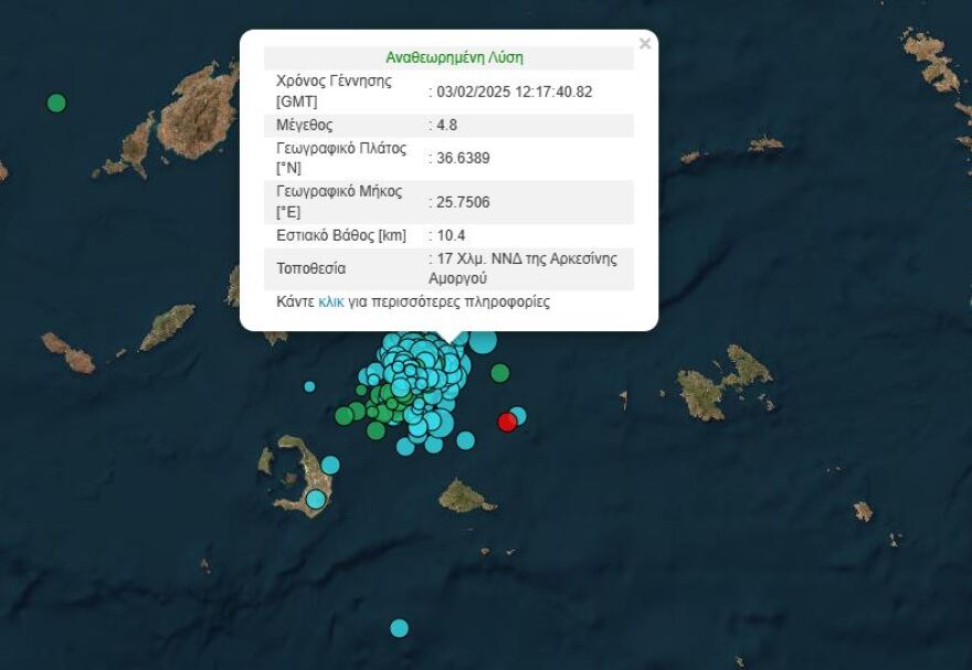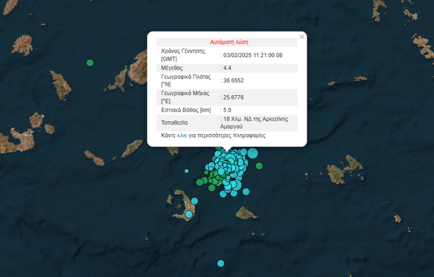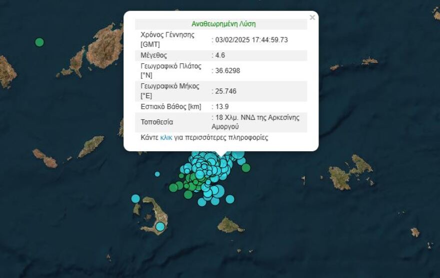 Σεισμός 4,5 Ρίχτερ σημειώθηκε στις 19.44 περίπου 18 χιλιόμετρα νότια - νοτιοδυτικά της Αρκεσίνης Αμοργού, σύμφωνα με την αναθεωρημένη λύση του Γεωδυναμικού Ινστιτούτου.