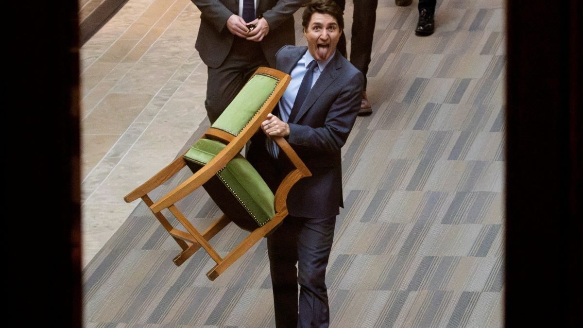 Ο Καναδός πρωθυπουργός Τζάστιν Τριντό κατά τη χθεσινή (10.03.2025) έξοδό του από τη Βουλή των Κοινοτήτων φαίνεται να κρατά στα χέρια του μια καλαίσθητη καρέκλα με πράσινη ταπετσαρία και με τη γλώσσα έξω σε μια παιχνιδιάρικη χειρονομία.