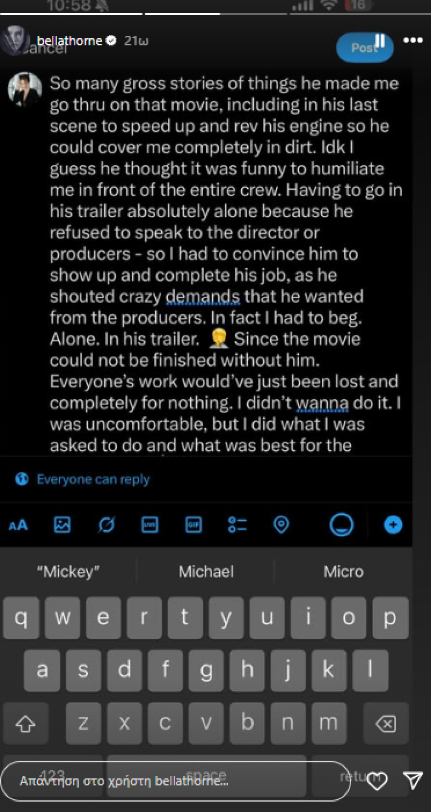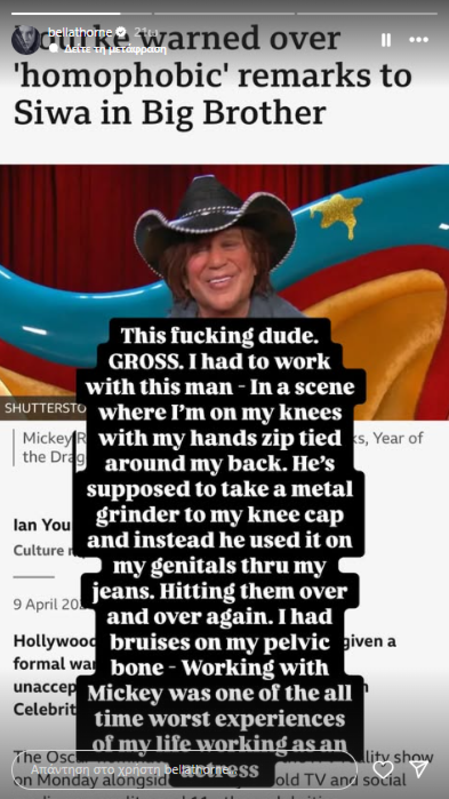 Με αφορμή το περιστατικό, η Μπέλα Θορν θυμήθηκε τη συνεργασία της μαζί του, χαρακτηρίζοντάς την ως «την χειρότερη της καριέρας της». Η ηθοποιός αναδημοσίευσε στο Ιnstagram ένα άρθρο για τα «αηδιαστικά» σχόλια του Μίκι Ρουρκ για την Τζότζο Σίγουα στο βρετανικό Celebrity Big Brother, φέρνοντας στη μνήμη της τη δική της εμπειρία μαζί του.