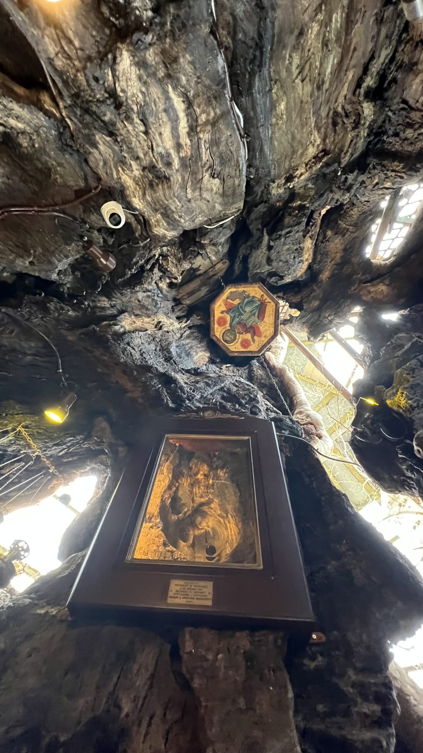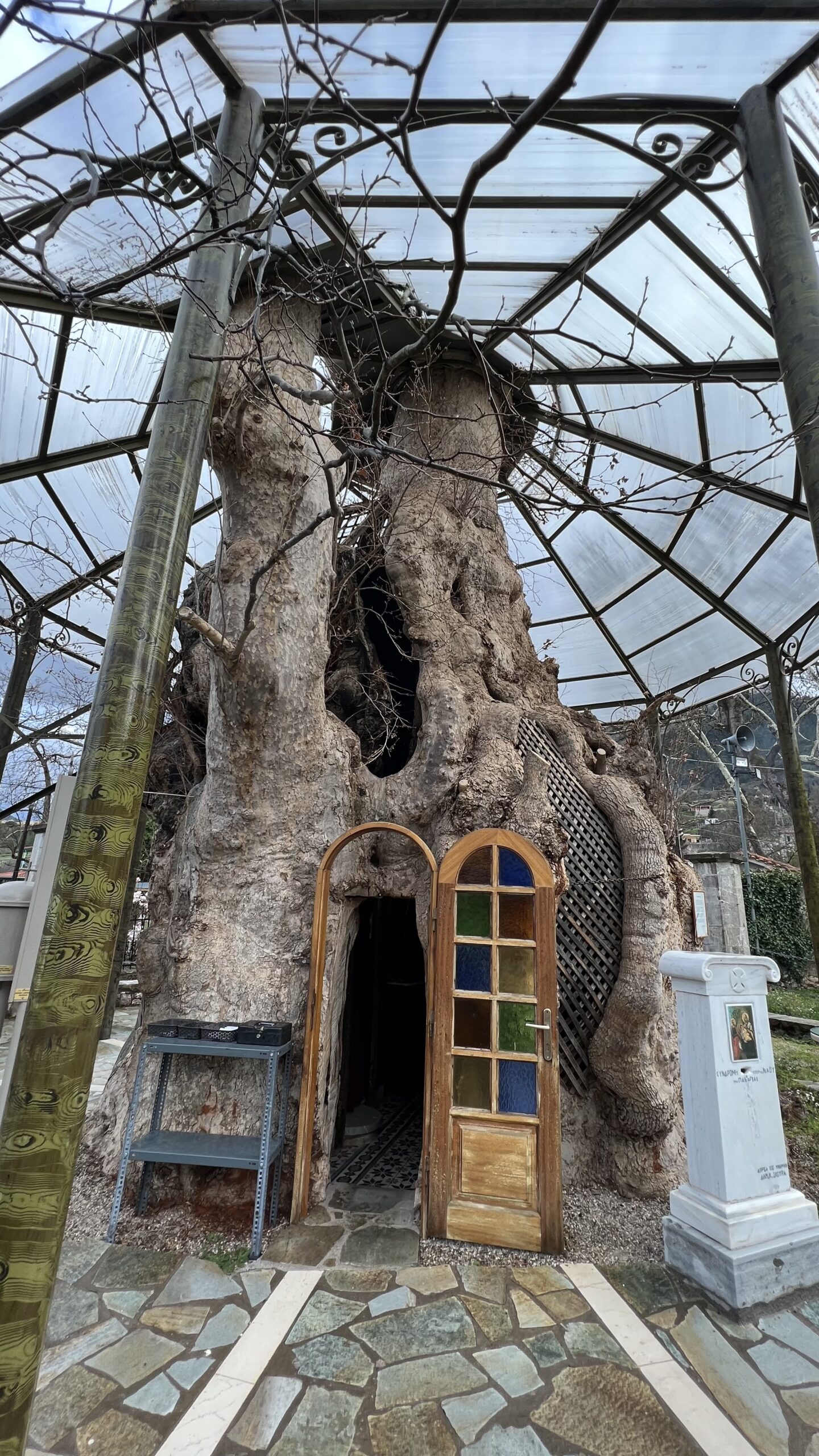 Σήμερα μέσα στην κουφάλα του πλάτανου υπάρχει ένα μικρό τέμπλο, εικόνες και γενικά όλα όσα βρίσκει κανείς σε μια ορθόδοξη εκκλησία. Ο πλάτανος έχει ύψος περίπου 25 μέτρα και περίμετρο στη βάση του περίπου 16 μέτρα. Εντός της ιδιαίτερης αυτής εκκλησίας δεν χωρούν πάνω από 20 άτομα. Στην πραγματικότητα το γιγαντιαίο αυτό πλατάνι είναι τρία πλατάνια που φύτρωσαν μαζί. Η εικόνα του τεράστιου αυτού δέντρου προκαλεί δέος και η επιλογή να εκφράσουν οι άνθρωποι τα θρησκευτικά τους πιστεύω σε αυτό -αν και φαινομενικά παράδοση- όταν κοιτά κανείς αυτό το θαύμα της φύσης μοιάζει φυσιολογική. Δυστυχώς πια αυτό το μεγαλόπρεπο φυσικό και θρησκευτικό μνημείο κινδυνεύει από την ασθένεια του μεταχρωματικού έλκους, μία αρρώστια που χτυπά τα πλατάνια και προκαλείται από ένα είδος μύκητα. Όπως μας είπαν οι ντόπιοι, η σημερινή του εικόνα δεν έχει σχέση με εκείνη παλαιότερων εποχών όταν τα καταπράσινα φύλλα πάνω από την εκκλησία δημιουργούσαν ένα υπέροχο θέαμα.