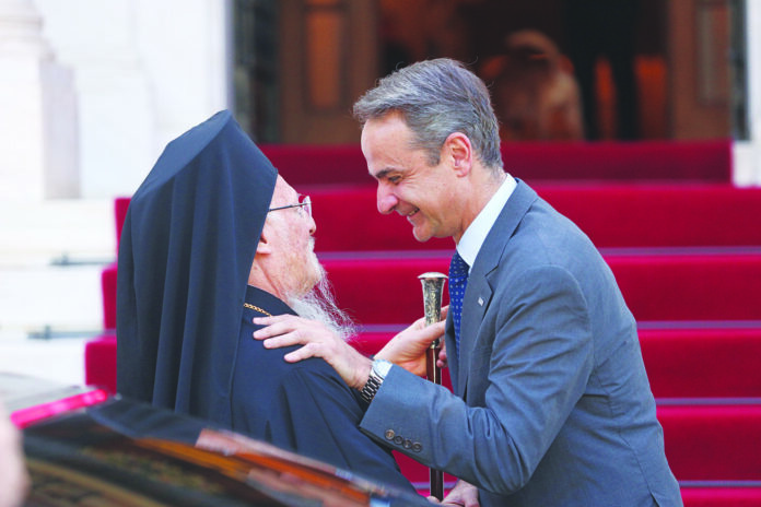 Συνάντηση με τον Οικουμενικό Πατριάρχη Βαρθολομαίο είχε χθες στο Μέγαρο Μαξίμου ο πρωθυπουργός Κυριάκος Μητσοτάκης στη σκιά των εξελίξεων αναφορικά με την Εκκλησία τη Κρήτης. Η τελευταία επίσημη συνάντησή τους είχε γίνει πάλι στο Μέγαρο Μαξίμου τον περασμένο Νοέμβριο, ενώ ανεπίσημα συναντήθηκαν πρόσφατα στο Βατικανό, καθώς και οι δύο είχαν παραστεί στην κηδεία του Πάπα Φραγκίσκου. Από αυτή τη συνάντηση χθες ο κ. Βαρθολομαίος έδωσε στον πρωθυπουργό κι ένα δώρο… μια φωτογραφία των δύο με την σύζυγο του κ. Μητσοτάκη, που τραβήχτηκε στην πλατεία του Αγίου Πέτρου!