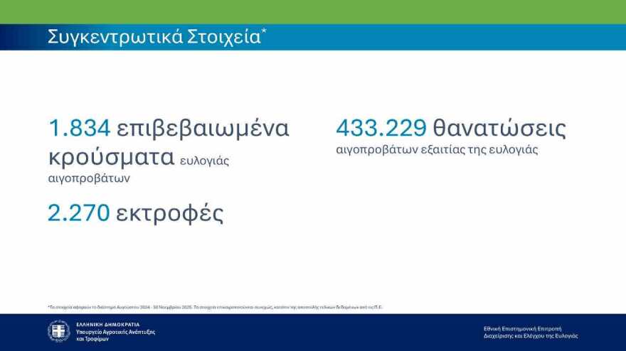 • ενώ έχουν θανατωθεί 433.229 ζώα, στο πλαίσιο εφαρμογής των προβλεπόμενων υγειονομικών πρωτοκόλλων.