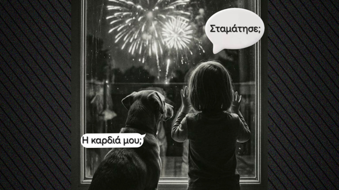 Στο σκίτσο για τα πυροτεχνήματα που - κατά την ΕΛΑΣ - «δεν είναι διασκεδαστικά για όλους», το παιδί ρωτάει «σταμάτησε;» και το σκυλί συμπληρώνει «η καρδιά μου;».