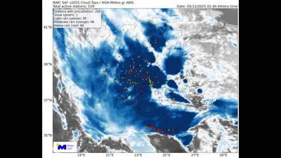 Σε αυτό το βίντεο παρουσιάζονται οι νεφώσεις όπως καταγράφηκαν δορυφορικά σε συνδυασμό με τους μετεωρολογικούς σταθμούς που καταγράφουν βροχόπτωση.