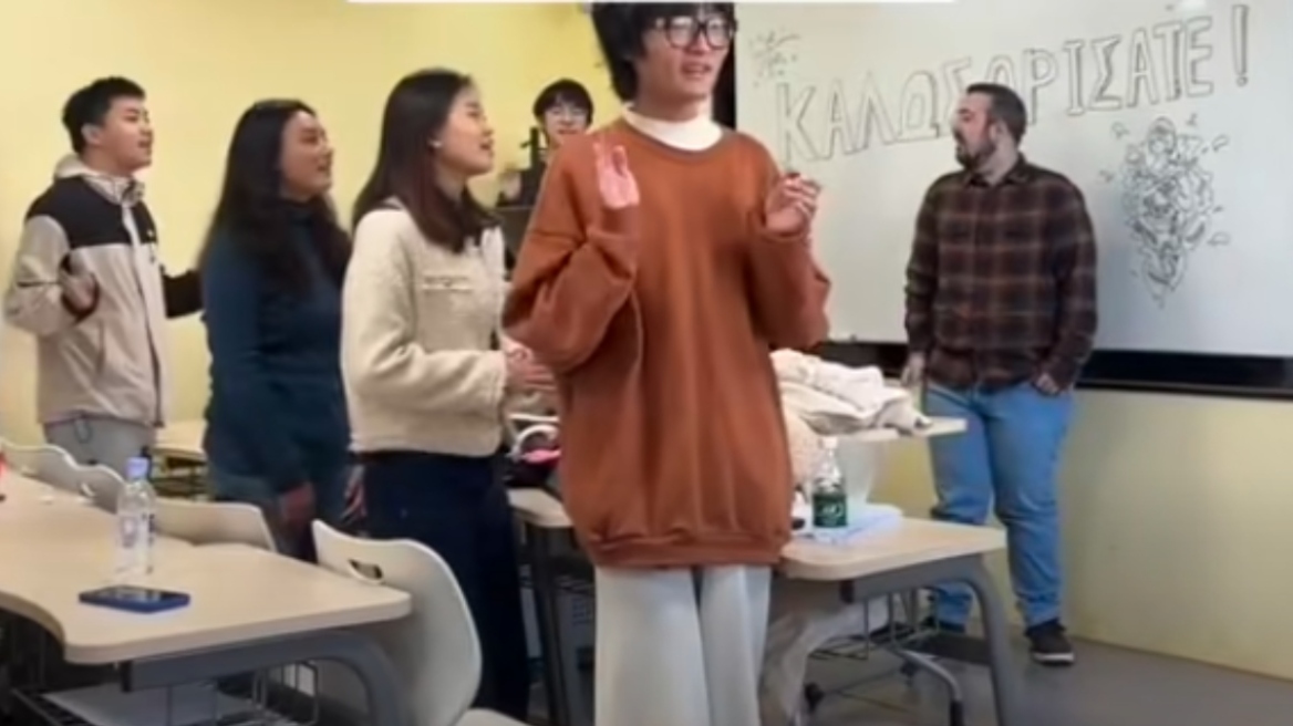 Στο βίντεο εμφανίζονται φοιτητές από το Πανεπιστήμιο Ξένων Σπουδών του Πεκίνου να καλωσορίζουν Έλληνες επισκέπτες