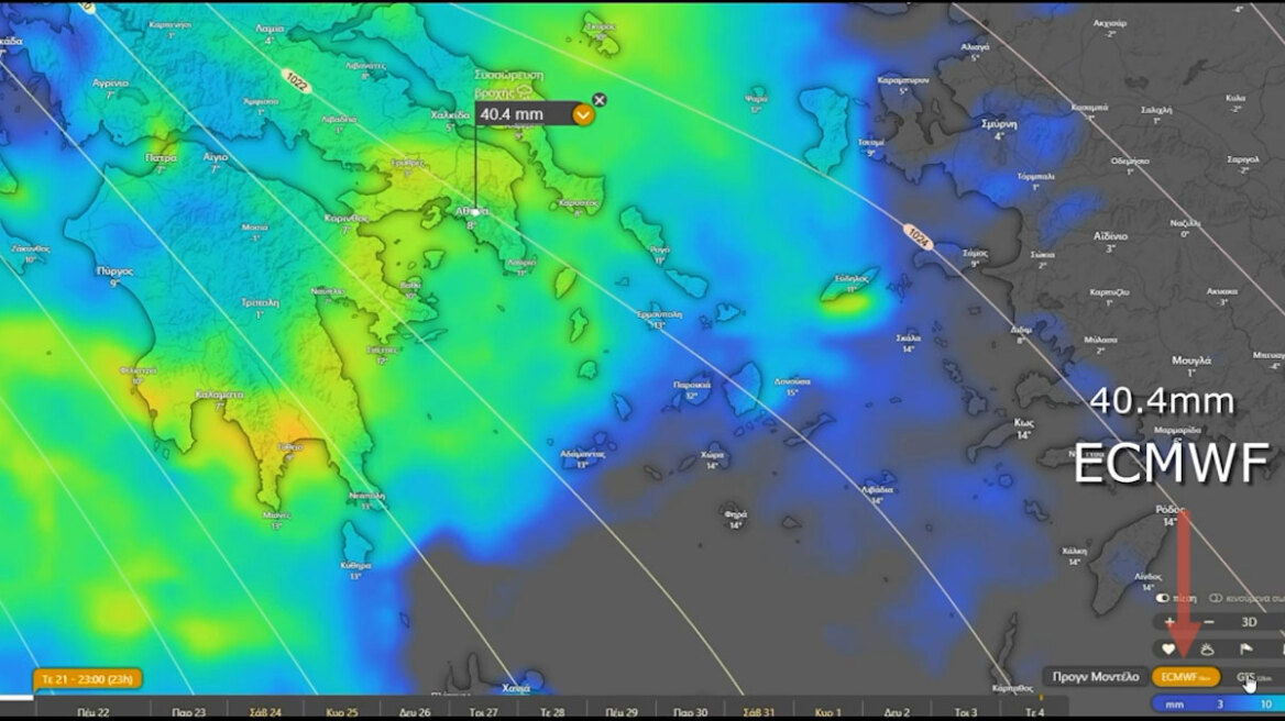 Το ευρωπαϊκό μοντέλο είναι συντηρητικό, αλλά σταθερόΤο ευρωπαϊκό μοντέλο ECMWF εμφανίζεται πιο συγκρατημένο στα ύψη βροχής, με τιμές γύρω στα 40–60 mm για την Αττική. Το πλεονέκτημά του δεν είναι η «ένταση», αλλά η χρονική συνοχή : από τρέξιμο σε τρέξιμο δεν παρουσιάζει απότομες διακυμάνσεις και αποτυπώνει καλύτερα τη διάρκεια του υετού. Αυτή η συμπεριφορά το καθιστά συχνά πιο αξιόπιστο σε επεισόδια παρατεταμένης βροχής, χωρίς έντονη καταιγιδογενή δομή.