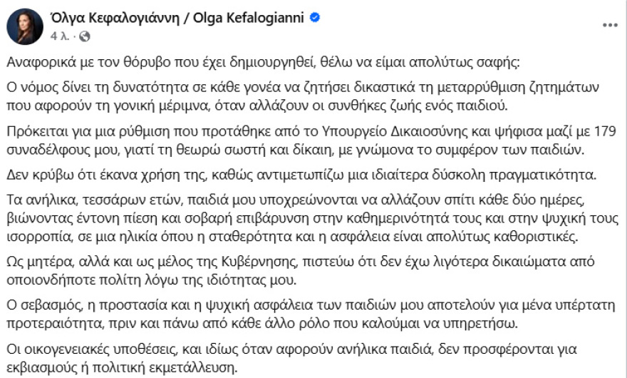 Takeawaysby Protothema AIΗ υπουργός Τουρισμού Όλγα Κεφαλογιάννη απάντησε μέσω facebook στον θόρυβο που προκλήθηκε από τη χρήση ρύθμισης του υπουργείου Δικαιοσύνης για την επιμέλεια των παιδιών της.