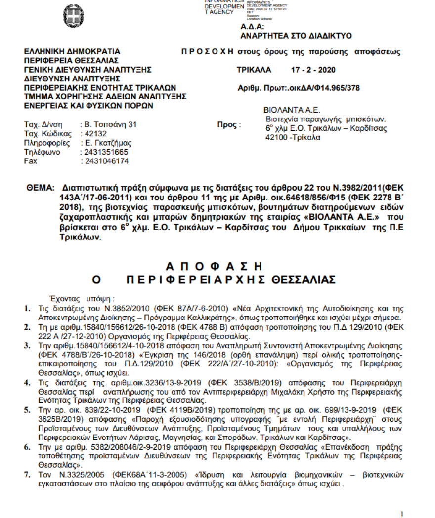 Παρατηρήσεις της Περιφέρειας για τις δεξαμενές προπανίουΣε έγγραφα που έχουν επίσης έρθει στο φως σχετικά με το εργοστάσιο Βιολάντα καταγράφεται και ένα ακόμη κρίσιμο στοιχείο. Το 2020, σε έγγραφο της Περιφέρειας Θεσσαλίας, σημειώνεται ότι οι δύο δεξαμενές προπανίου του εργοστασίου δεν είχαν τοποθετηθεί στο σωστό σημείο, γεγονός που πλέον εξετάζεται σε συνδυασμό με τις συνθήκες που οδήγησαν στο δυστύχημα.