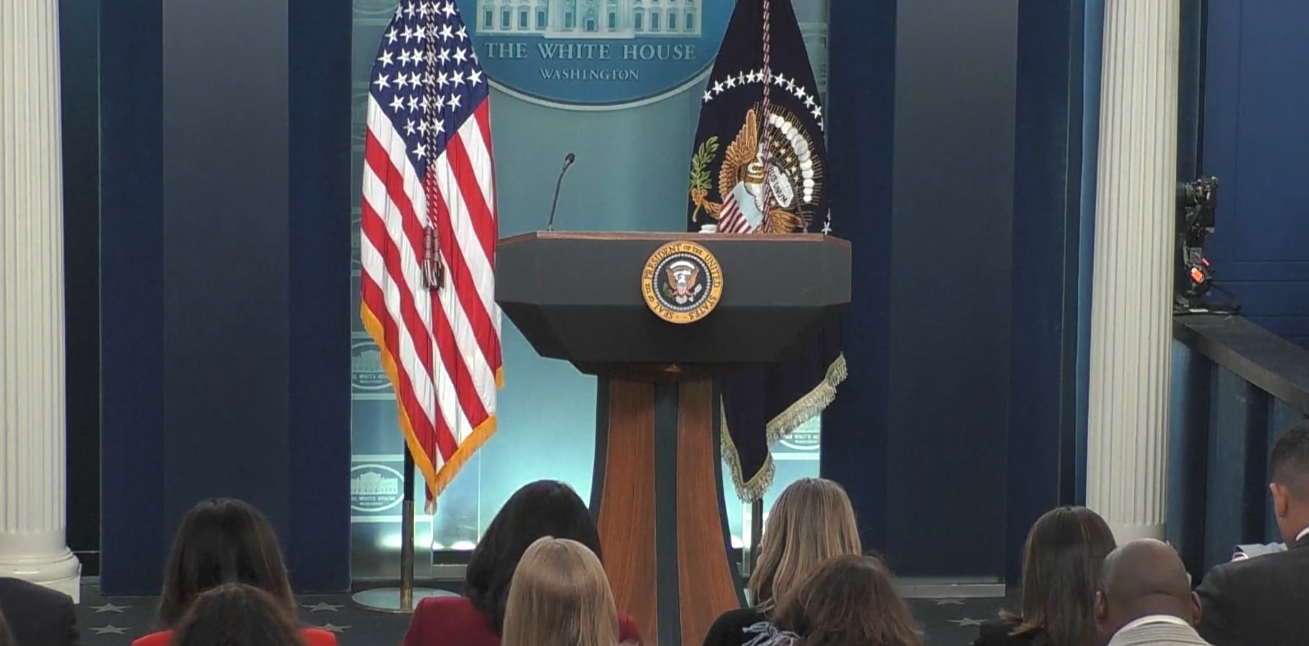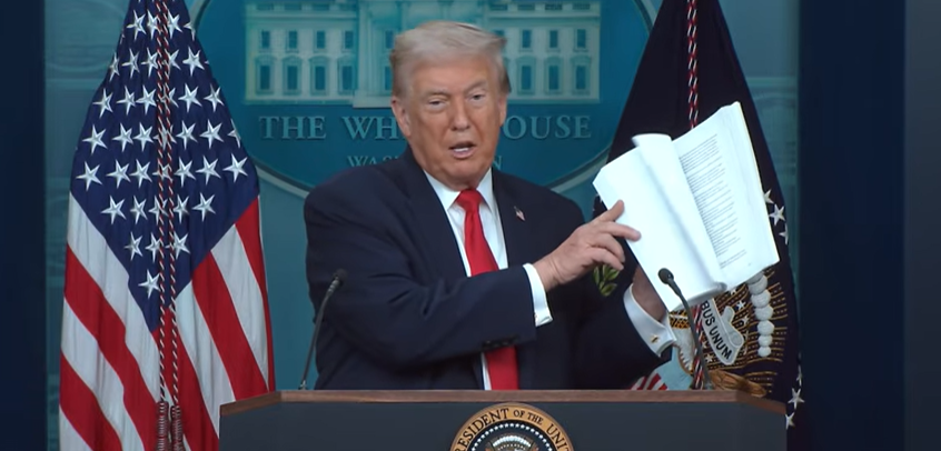 Ο Τραμπ, καθώς ξεφύλλιζε τα χαρτιά όρθιος στο βήμα, έδειχνε μάλλον συγκρατημένος. Για αρκετή ώρα παρέμενε σιωπηλός, κοιτώντας τα έγγραφα, πριν τραβήξει ορισμένα και τα δείξει στους συγκεντρωμένους δημοσιογράφους.