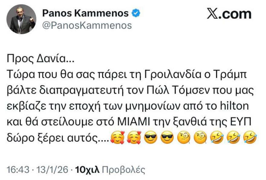 «Ξέρει αυτός»... Με τη μόνιμη επωδό των τελευταίων αναρτήσεών του, ο Πάνος Καμμένος «ξαναχτύπησε», αυτή τη φορά για τα σχέδια του προέδρου των ΗΠΑ για τη Γροιλανδία. Ο πρώην υπουργός καλεί τους Δανούς να ορίσουν ως διαπραγματευτή τον Πόλ Τόμσεν «που μας εκβίαζε την εποχή των μνημονίων από το Χίλτον», όπως γράφει, υποσχόμενος ότι σε αντάλλαγμα «θα στείλουμε στο Μαϊάμι την ξανθιά της ΕΥΠ δώρο». Κι όποιος κατάλαβε...