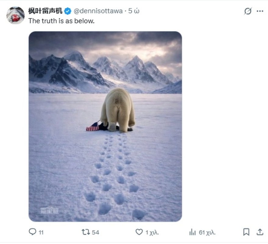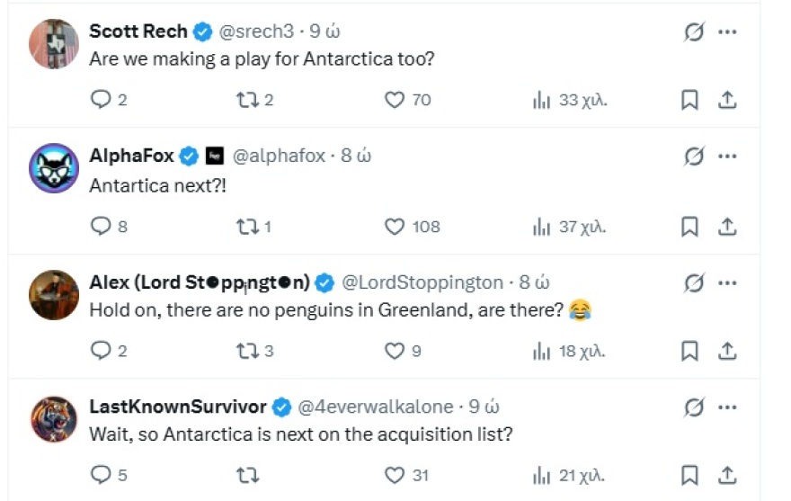 Κάποιοι χρήστες ερμήνευσαν την παρουσία του πιγκουίνου ως πρόθεση κατάκτησης της Ανταρκτικής.Η επιθυμία του Ντόναλντ Τραμπ να αποκτήσει τη Γροιλανδία είναι δεδομένη και ο Αμερικανός πρόεδρος δεν την έχει κρύψει, ακόμη και προεκλογικά. Ένα νέο «χτύπημα» μετά τις διαβουλεύσεις και τις αντιπαραθέσεις στο Νταβός, ήρθε τη νύχτα της Παρασκευής από τον Λευκό Οίκο, ο οποίος «ανέβασε» ανάρτηση, που προκάλεσε σωρεία αντιδράσεων από χρήστες του μέσου.