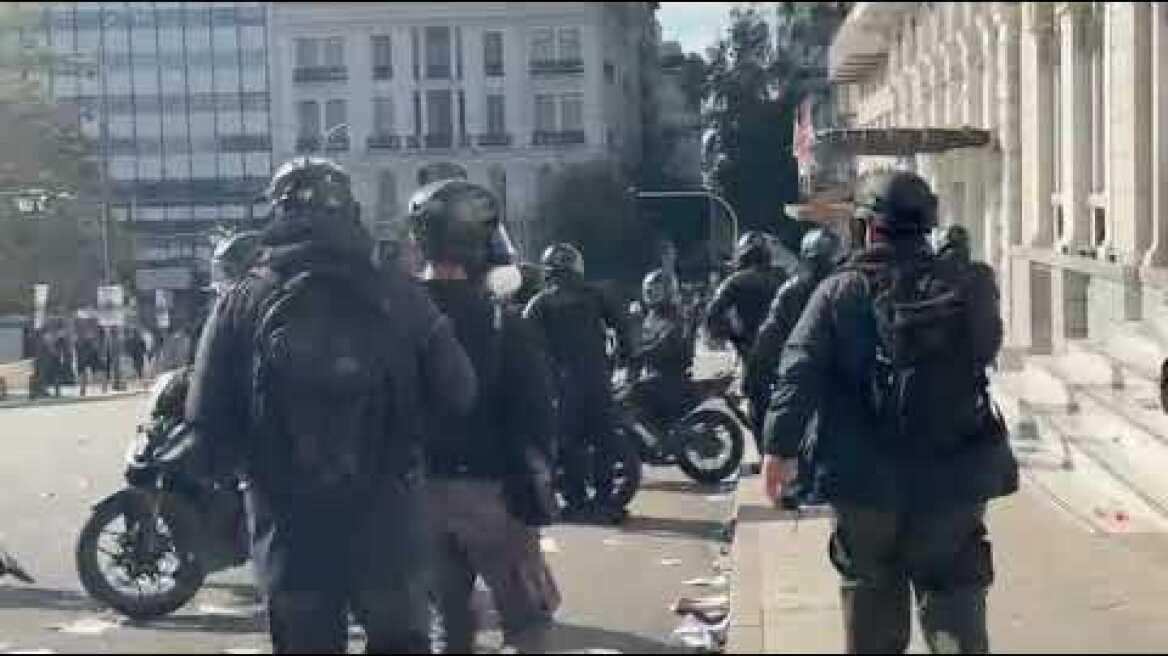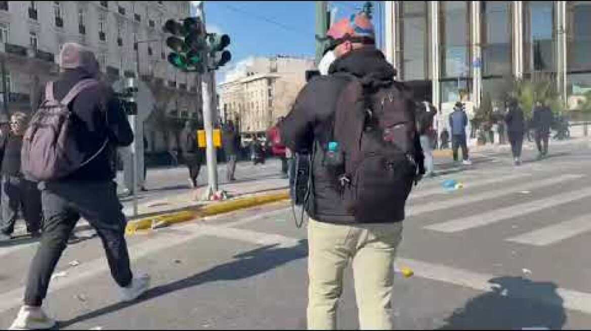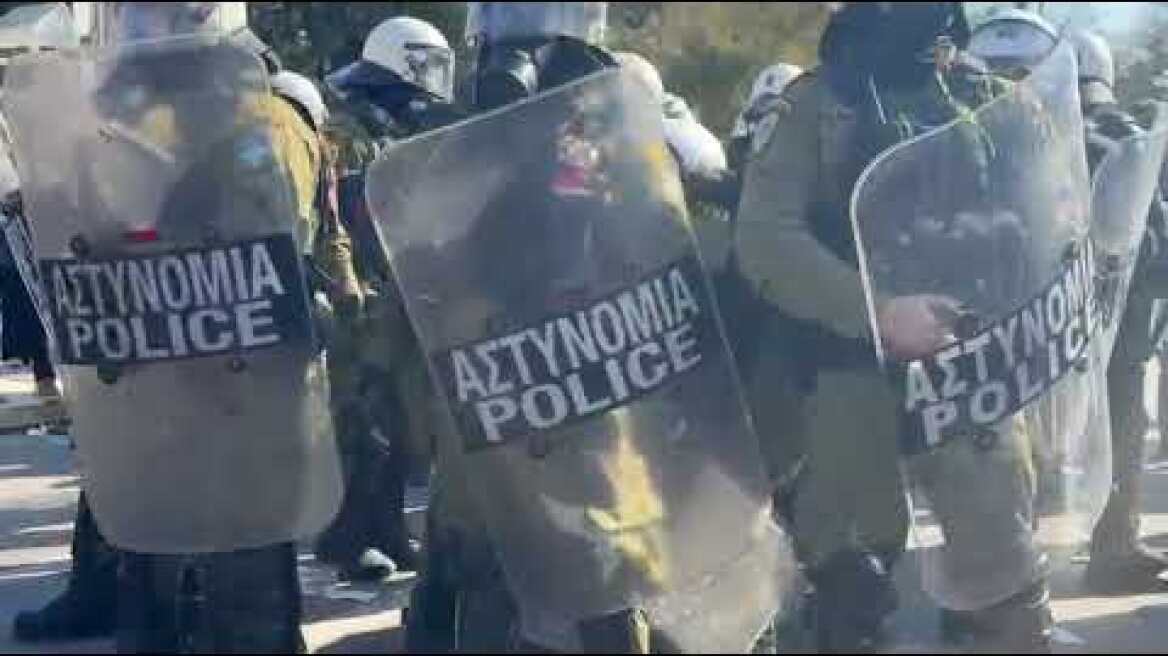 Αυτή τη στιγμή υπάρχει ρίψη μπουκαλιών και πετροπόλεμος μεταξύ κουκουλοφόρων και της Αστυνομίας.