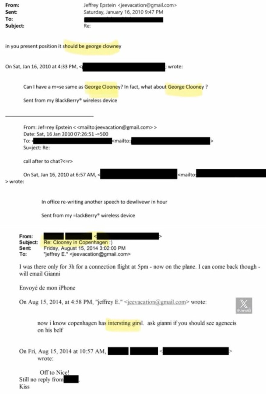 Ο Τζορτζ ΚλούνεϊΟ στενός φίλος του Έπσταϊν όμως, Λόρδος Πίτερ Μάντεσον, ενέπλεξε κι έναν ακόμη διάσημο ηθοποιό του Χόλιγουντ, τον Τζορτζ Κλούνεϊ, στα σκοτεινά δίχτυα του σοκαριστικά εγκληματικού βίου του. Συγκεκριμένα, τον Ιανουάριο του 2010, κι ενώ ο Έπστάιν φέρεται να βρισκόταν στην Κοπεγχάγη μαζί με τον γνωστό ηθοποιό, διημείφθη μεταξύ τους ο παρακάτω ηλεκτρονικός διάλογος: «Τώρα ξέρω πως η Κοπεγχάγη έχει ενδιαφέροντα κορίτσια…» γράφει ο Έπστάιν με τον Μάντελσον να του απαντά: «Μπορώ να έχω μια μούσα ίδια με αυτή του Τζορτζ Κλούνεϊ;».