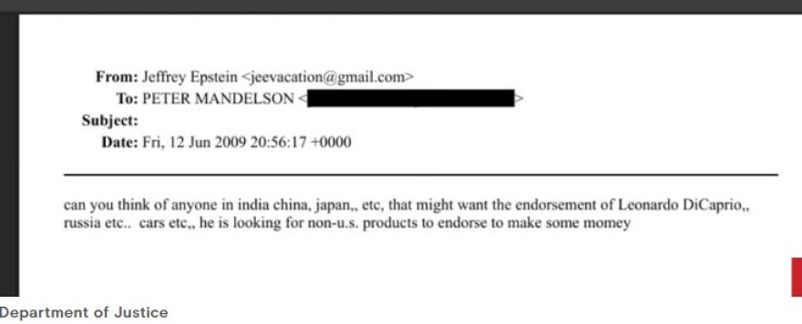 Σύμφωνα με τα στοιχεία που δόθηκαν στη δημοσιότητα, τον Ιούνιο του 2009, ο Τζέφρι Έπσταϊν έγραφε στον ισχυρό Βρετανό πολιτικό και πρώην πλέον πρέσβη του Ηνωμένου Βασιλείου στις ΗΠΑ, Λόδρο Πίτερ Μάντελσον: «Μπορείς να σκεφτείς κάποιον σε Ινδία, Κίνα, Ιαπωνία, Ρωσία κ.α. που θα μπορούσε να θέλει την υποστήριξη του Λεονάρντο Ντι Κάπριο Ρωσίας κ.λπ.... αυτοκινήτων κ.λπ.; Ψάχνει για μη αμερικανικά προϊόντα για να προωθήσει για να βγάλει χρήματα».