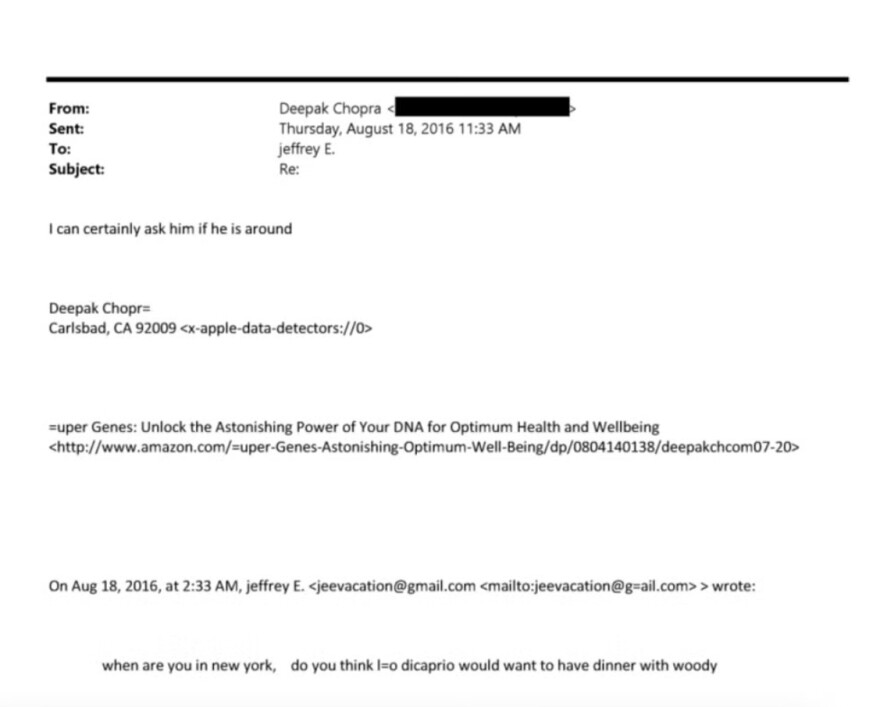Σε άλλα μέιλ που ανταλλάχθηκαν μεταξύ του Έπσταϊν και του ινδοαμερικανού συγγραφέα Deepak Chopra, ο οποίος κάνει καριέρα ως γκουρού της εναλλακτικής ιατρικής, γίνεται αναφορά στο κανόνισμα μιας συνάντησης του Ντι Κάπριο με τον Γούντι Άλεν, ο οποίος από προηγούμενα αρχεία που έχουν βγει στη δημοσιότητα ανήκε στον στενό κοινωνικό κύκλο του καταδικασμένου παιδεραστή: «Όταν είσαι στη Νέα Υόρκη, πιστεύεις πως ο Ντι Κάπριο θα ήθελε να δειπνήσει με τον Γούντι;» ρωτά ο Έπσταϊν για να λάβει την απάντηση: «Φυσικά, μπορώ να τον ρωτήσω όταν μιλήσουμε.»