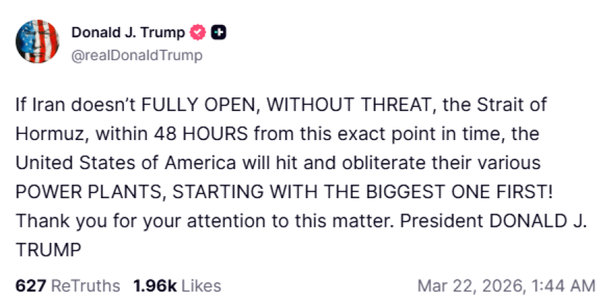 «Εάν το Ιράν δεν ΑΝΟΙΞΕΙ ΠΛΗΡΩΣ, ΧΩΡΙΣ ΑΠΕΙΛΕΣ, τα Στενά του Ορμούζ εντός 48 ΩΡΩΝ από αυτή τη στιγμή, οι Ηνωμένες Πολιτείες της Αμερικής θα πλήξουν και θα καταστρέψουν τις διάφορες μονάδες παραγωγής ενέργειας, ξεκινώντας από τη μεγαλύτερη! Ευχαριστώ για την προσοχή σας στο ζήτημα αυτό. Πρόεδρος ΝΤΟΝΑΛΝΤ ΤΖ. ΤΡΑΜΠ».