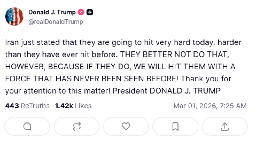 "Το Ιράν μόλις ανακοίνωσε ότι θα χτυπήσουν πολύ σκληρά σήμερα, σκληρότερα από ποτέ", έγραψε ο Τραμπ στο Truth Social.