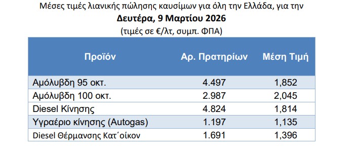Αυτό φαίνεται και από τα στοιχεία του Παρατηρητηρίου Τιμών Υγρών Καυσίμων του Υπουργείου Ανάπτυξης. Για την Δευτέρα 9/3, η μέση τιμή της απλής αμόλυβδης πανελλαδικά ήταν 1,852 ευρώ.