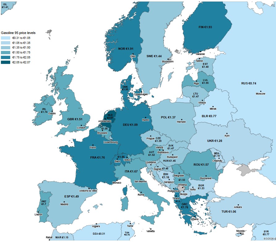 Ο χάρτης με τις τιμές βενζίνης στην Ευρώπη