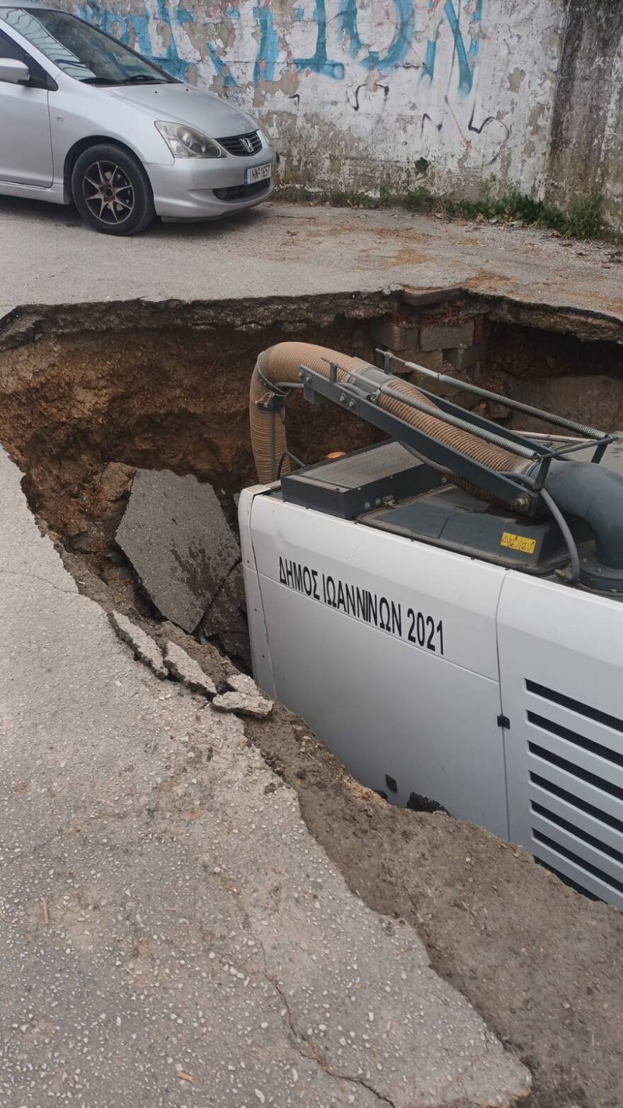 Μεγάλη καθίζηση του οδοστρώματος σημειώθηκε επί της οδού Βελισσαρίου στα Ιωάννινα στο ύψος του σχολικού συγκροτήματος όπου στεγάζονται τα ΕΠΑΛ και ένα ΓΕΛ.