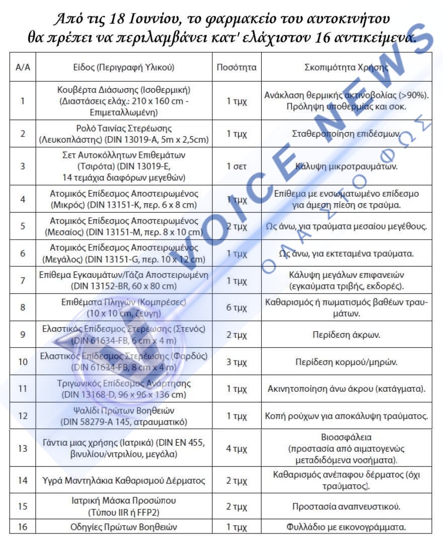 Σε αυτό το πλαίσιο εντάσσεται και η απόφαση του Κυρανάκη για το «φαρμακείο» αυτοκινήτου, με τα 16 αντικείμενα που πρέπει να περιλαμβάνει το κουτί πρώτων βοηθειών από τις 18 Ιουνίου και είναι τα εξής: