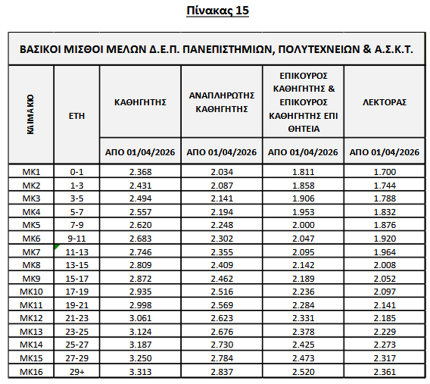 ΠαραδείγματαΗ εγκύκλιος δίνει και συγκεκριμένα παραδείγματα εφαρμογής για ειδικά μισθολόγια. Για παράδειγμα, στέλεχος της Ελληνικής Αστυνομίας με βαθμό Αστυνόμου Β’, κατηγορίας Α’, και 15 έτη συνολικής υπηρεσίας, από βασικό μισθό 1.860 ευρώ στις 31.03.2026, ανεβαίνει στα 1.900 ευρώ από 01.04.2026.
