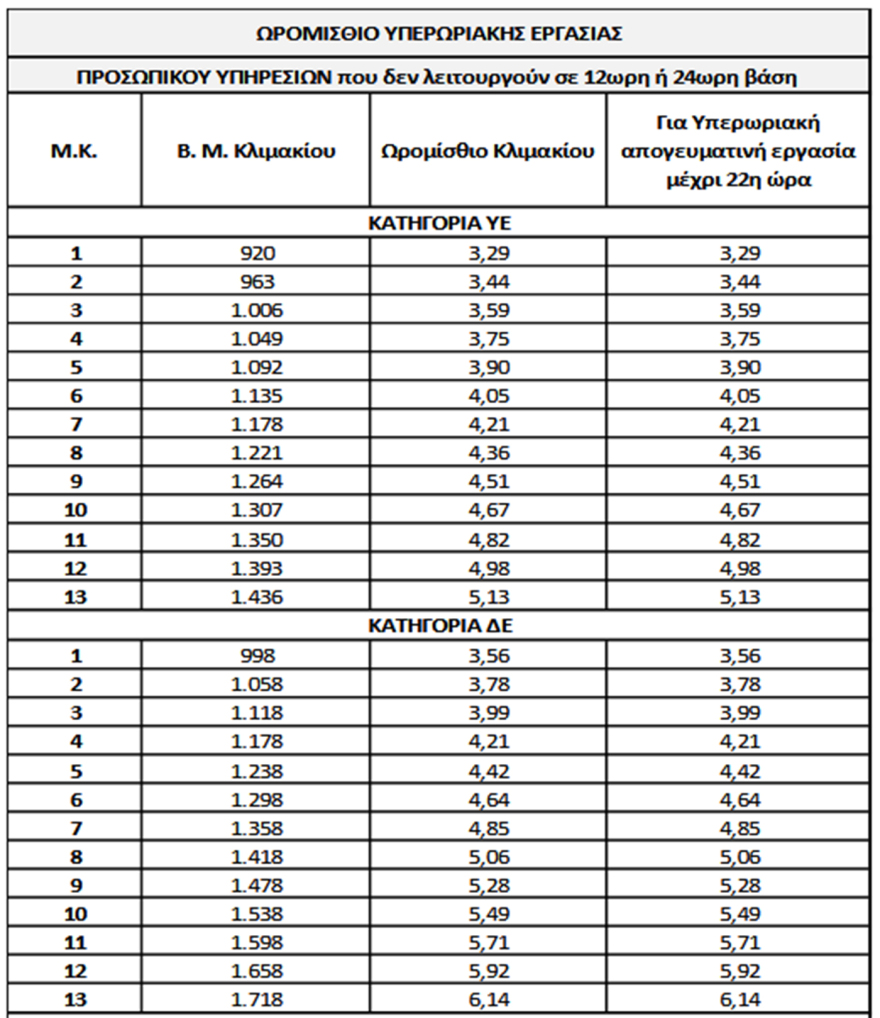 Για την κατηγορία ΥΕ, ο εισαγωγικός μισθός διαμορφώνεται στα 920 ευρώ για 0-3 έτη υπηρεσίας, στα 963 ευρώ για 3-6 έτη, στα 1.006 ευρώ για 6-9 έτη και στα 1.049 ευρώ για 9-12 έτη υπηρεσίας. Στα επόμενα κλιμάκια, οι αποδοχές διαμορφώνονται σε 1.092 ευρώ, 1.135 ευρώ, 1.178 ευρώ, 1.221 ευρώ, 1.264 ευρώ, 1.307 ευρώ, 1.350 ευρώ, 1.393 ευρώ και 1.436 ευρώ, ανάλογα με τα έτη υπηρεσίας έως και το ανώτερο κλιμάκιο.