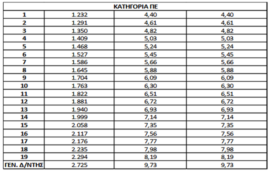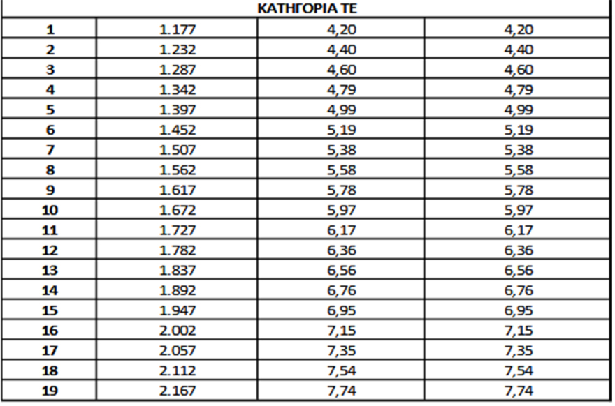 Για την κατηγορία ΔΕ, οι βασικοί μισθοί ξεκινούν από 998 ευρώ και φθάνουν έως 1.718 ευρώ. Για την κατηγορία ΤΕ ξεκινούν από 1.177 ευρώ και φθάνουν έως 2.167 ευρώ, ενώ για την κατηγορία ΠΕ ξεκινούν από 1.232 ευρώ και φθάνουν έως 2.294 ευρώ.