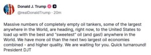 «Τεράστιος αριθμός εντελώς άδειων τάνκερ, μερικά από τα μεγαλύτερα στον κόσμο, κατευθύνονται αυτή τη στιγμή προς τις Ηνωμένες Πολιτείες για να φορτώσουν με το καλύτερο και ‘’πιο γλυκό’’ πετρέλαιο (και φυσικό αέριο!) στον κόσμο», ανέφερε χαρακτηριστικά.