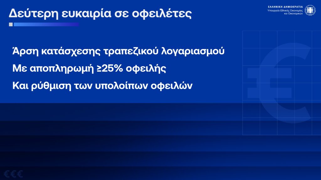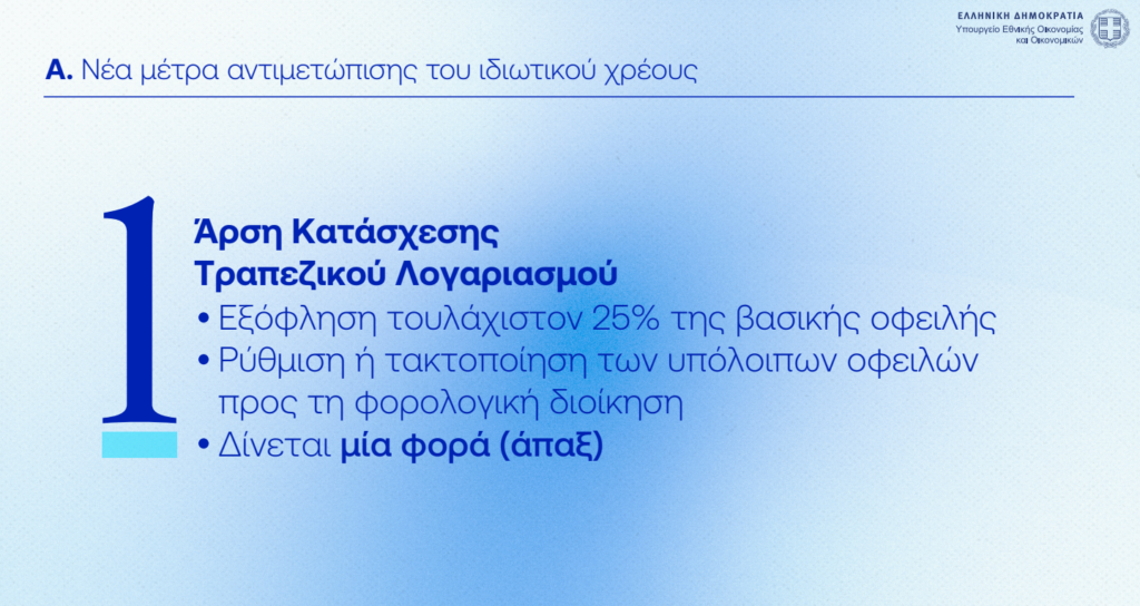 Για αντιμετώπιση ιδιωτικού χρέους – Δυνατότητα άρσης κατάσχεσης τραπεζικού λογαριασμού – Δυνατότητα ένταξης σε εξωδικαστικό και για χρέη 5.000 έως 10.000 ευρώ – Δυνατότητα ένταξης σε ρύθμιση 72 δόσεων για αρρύθμιστες παλιές οφειλές – Αφορά 1,3 εκ. φυσικά και 284 χιλ. νομικά πρόσωπα με 95,3 δισ. ευρώ οφειλές.