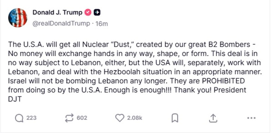 «Οι ΗΠΑ θα λάβουν όλη την “πυρηνική σκόνη” που δημιουργήθηκε από τα μεγάλα βομβαρδιστικά B-2 μας. Δεν θα δοθούν χρήματα με κανέναν τρόπο, σε καμία μορφή», ανέφερε χαρακτηριστικά.