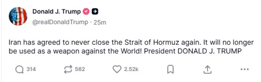 «Το Ιράν μόλις ανακοίνωσε ότι τα Στενά του Ιράν είναι πλήρως ανοιχτά και έτοιμα για απρόσκοπτη διέλευση. Ευχαριστούμε» έγραψε στην πρώτη ανάρτησή του για τα Στενά του Ορμούζ ο πρόεδρος των ΗΠΑ, Ντόναλντ Τραμπ.