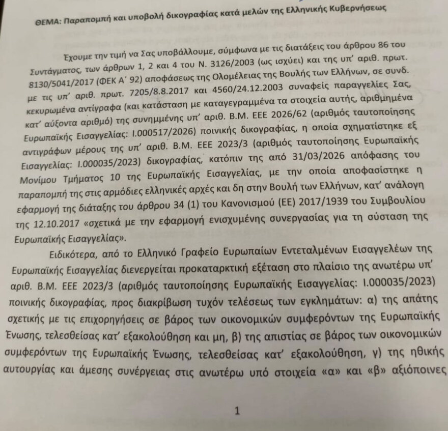 “Στο πλαίσιο της εν λόγω ποινικής δικογραφίας, προέκυψαν στοιχεία, τα οποία σχετίζονται με: 1) τον τέως Υπουργό Αγροτικής Ανάπτυξης και Τροφίμων Σπυρίδωνα - Παναγιώτη Λιβανό 2) την τέως Υφυπουργό Αγροτικής Ανάπτυξης και Τροφίμων Φωτεινή Αραμπατζή, για την αξιόποινη πράξη της ηθικής αυτουργίας σε απιστία κατ εξακολούθηση η οποία φέρεται τελεσθείσα κατά την άσκηση των καθηκόντων τους στην Αθήνα κατά το έτος 2021 τα οποία υποβάλλουμε χωρίς καμία αξιολόγηση και παρακαλούμε για τις δικές σας περαιτέρω ενέργειες, λόγω της ιδιότητας των ανωτέρω αναφερόμενων ως (τεως) Υπουργού και Υφυπουργού αντίστοιχα σύμφωνα με τις προαναφερθείσες διατάξεις.